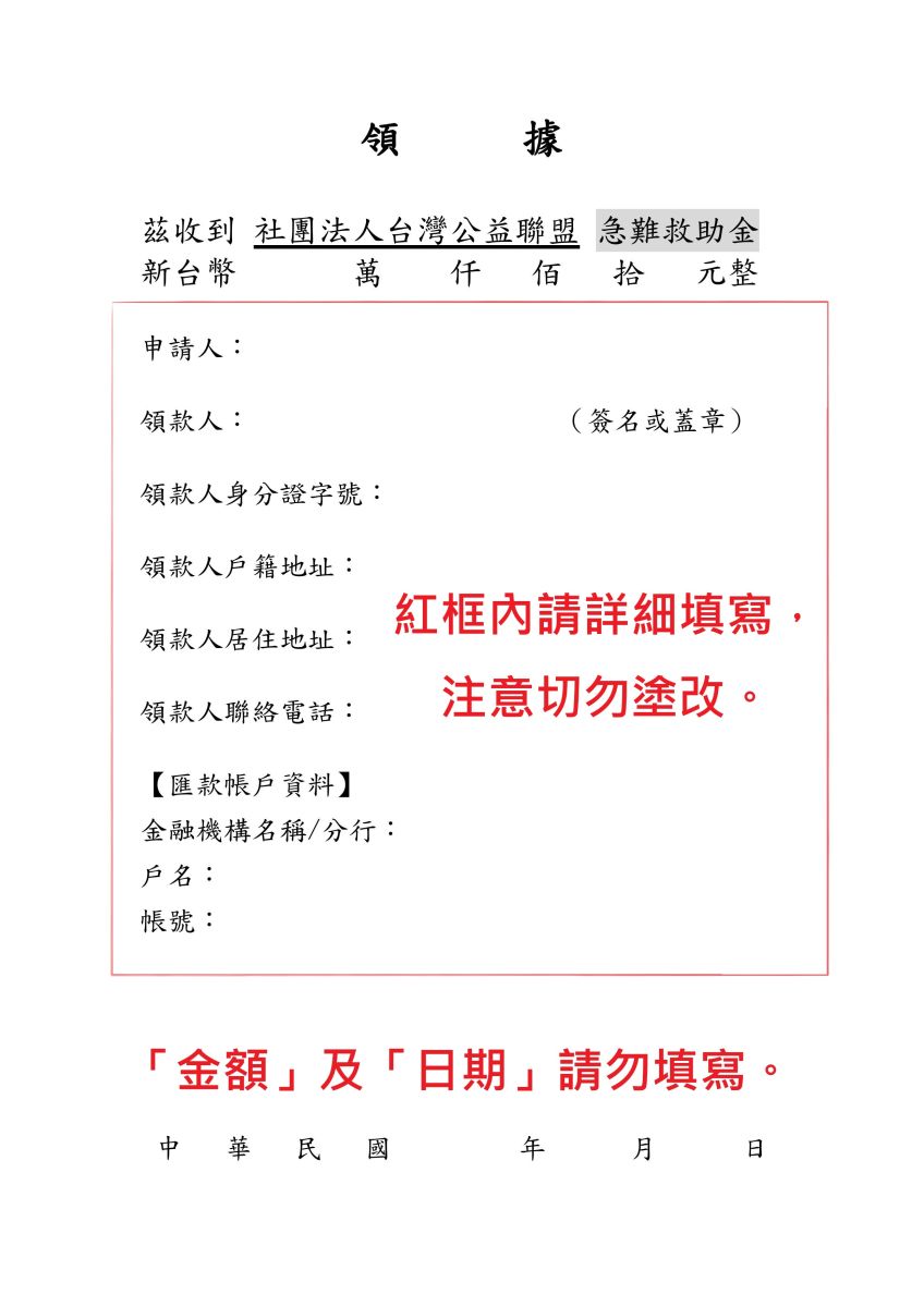 請將上述文件備齊後,以掛號郵寄至:231新北市新店區建國路219-1號3樓 台灣公益聯盟公益發展部